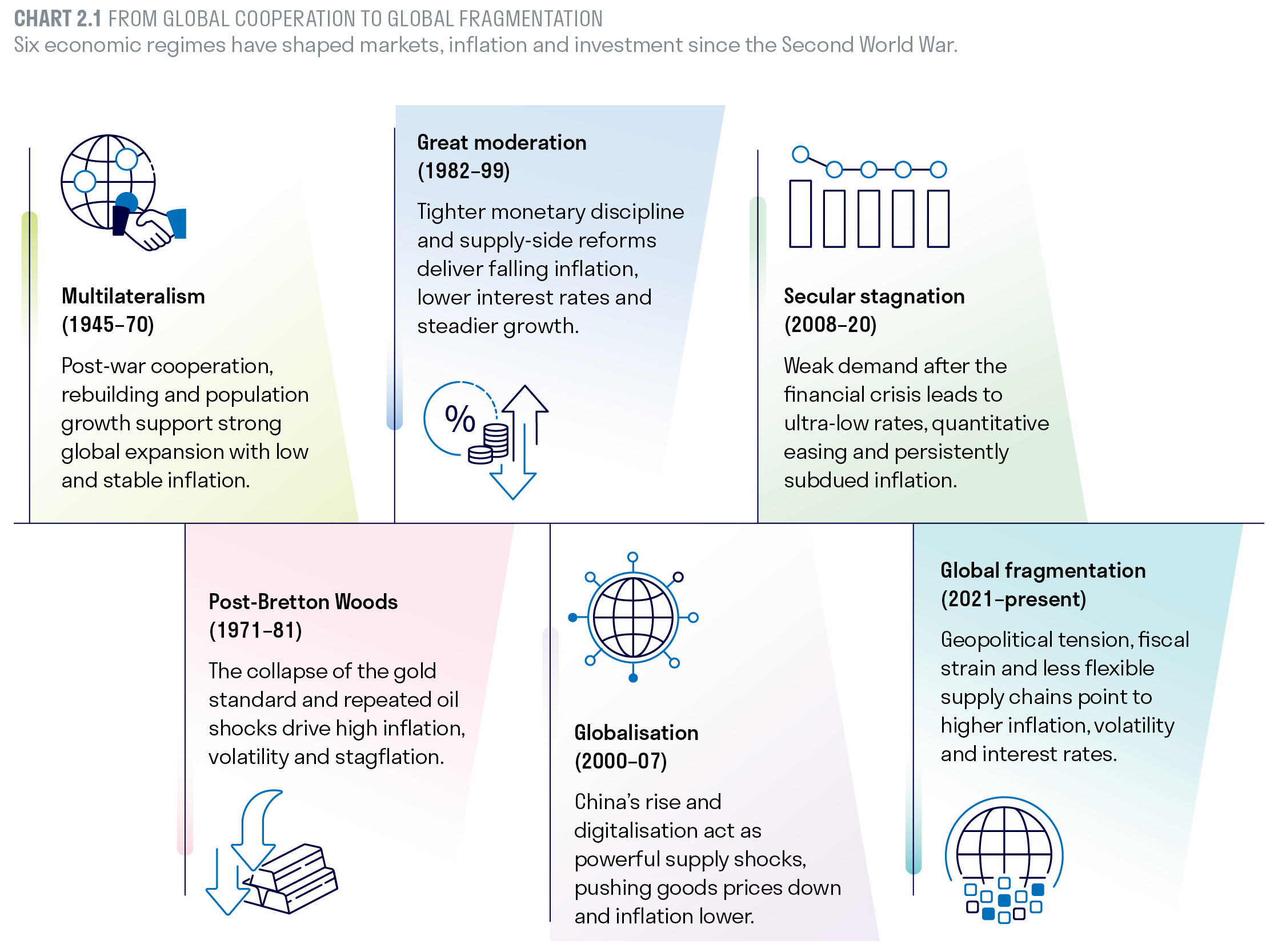 The regimes we have identified and outlined below span several decades, reaching back to the end of the Second World War in 1945. When examining these periods, it is important to recognise that, within any given regime, variables such as growth, inflation, interest rates, and bond yields oscillate around distinct trends. However, these trends do not persist indefinitely; regimes shift when imbalances accumulate over time – for example, during the global financial crisis of 2008–09, or the breakdown of the Bretton Woods system in the early 1970s[1] (which had maintained fixed exchange rates, with the US dollar convertible into gold at $35 per ounce).